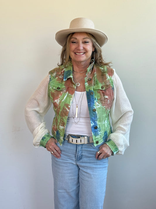 distressed tiedye denim + soft cream blouse sleeves [m/l]