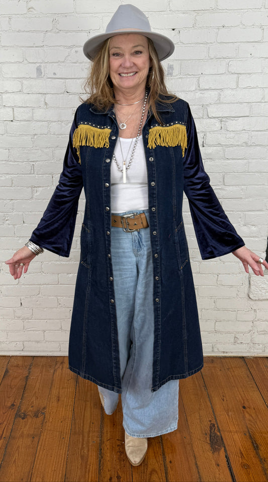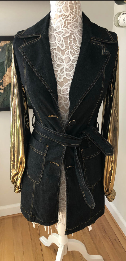 gold lamé blousy bells + dark denim dress jacket [xs]