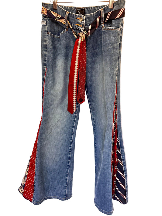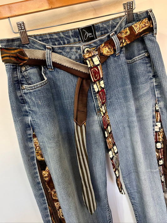 from boardroom to boho — upcycled jeans meet vintage neckties.