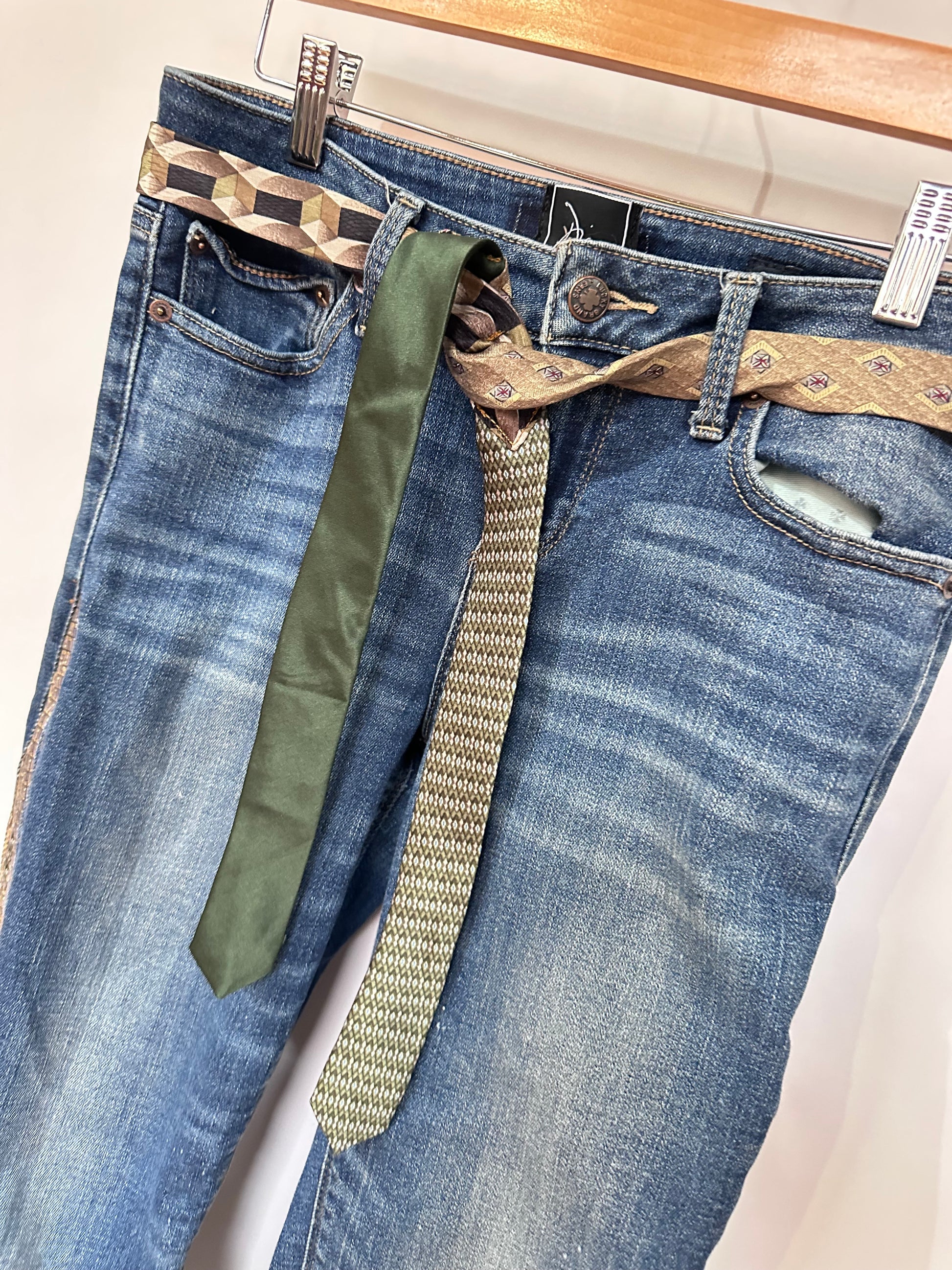 refined blue denim with subtle whisker detailing pairs beautifully with golden olive necktie-inspired bells. a sophisticated accessory combination that elevates any ensemble with designer-quality craftsmanship + distinctive charm.
