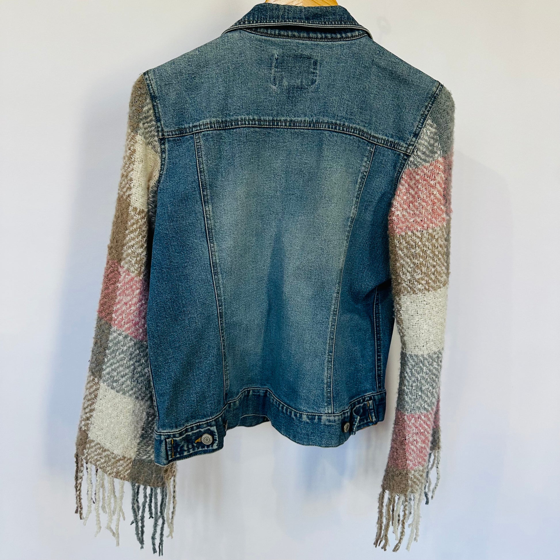 light wash feminine denim with soft plaid fringed sleeves [m]