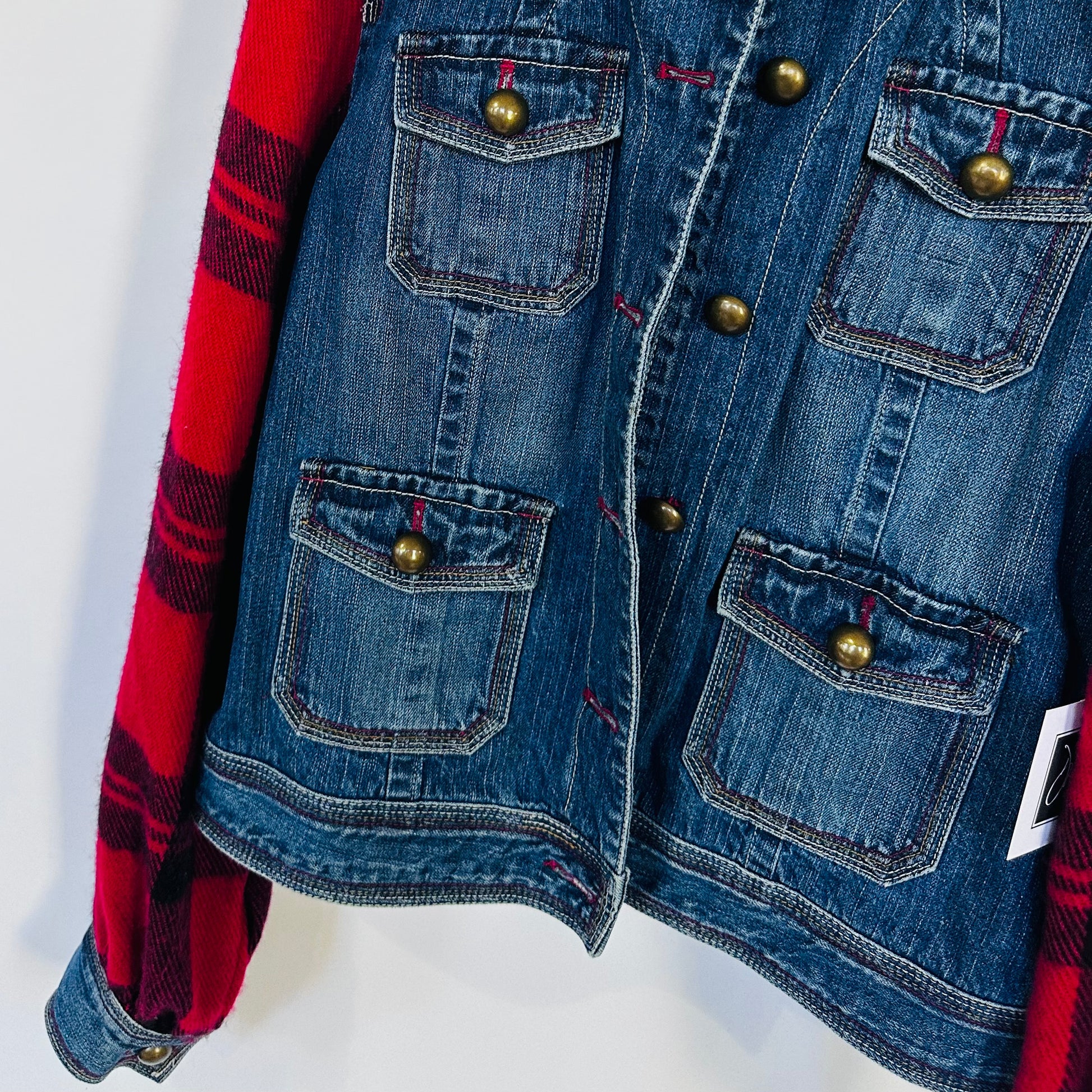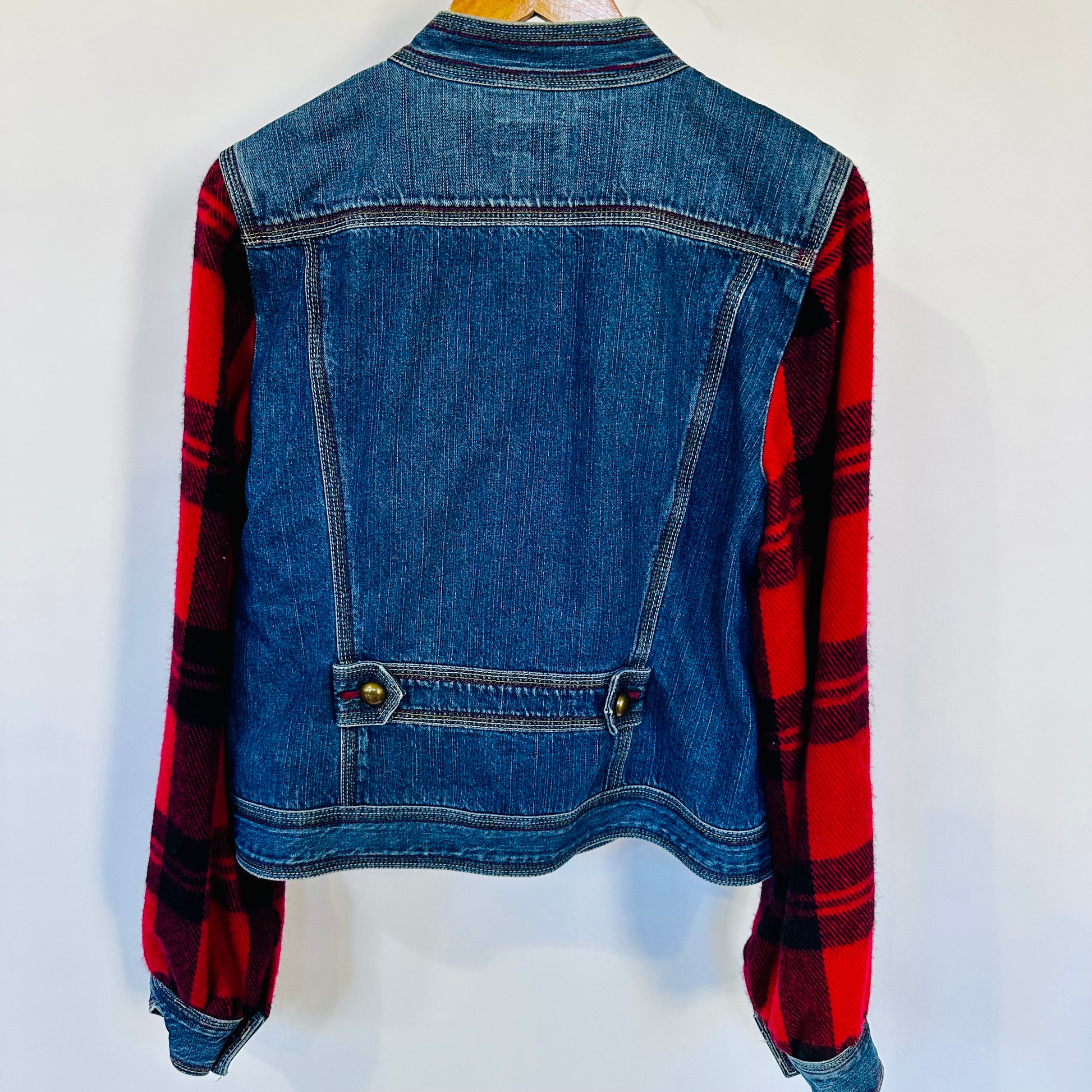military-inspired denim with a playful edge. bolero collar + fun stitching details pair beautifully with soft plaid blouse sleeves for a look that's equal parts tough + charming.